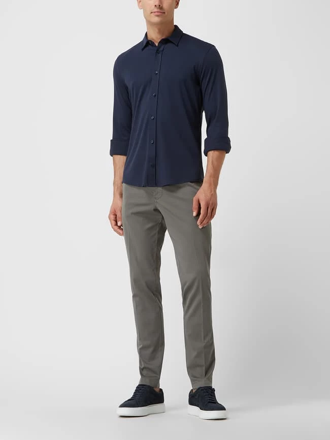 Die Chino von CINQUE ist aus einem Baumwoll-Elasthan-Mix gefertigt. Sie kommt mit schmal zulaufendem Bein, Reißverschluss und französischen Eingrifftaschen. Der Vorteil von Chinos? Sie sind zeitlos und kaschieren kräftige Oberschenkel.